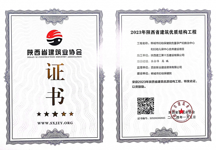 初心守品質(zhì),匠心筑精品。近日,陜建十五建公司承建的韓城婦幼危重孕產(chǎn)婦救治和兒保中心項(xiàng)目獲評(píng)省級(jí)建筑優(yōu)質(zhì)結(jié)構(gòu)工程,這是該項(xiàng)目繼獲得“2022年度省級(jí)文明工地”榮譽(yù)后又一重要獎(jiǎng)項(xiàng)!